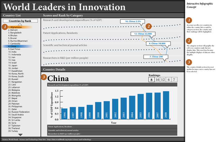 World Leaders in Innovation is an interactive infographic concept that utilized data from the World Bank.